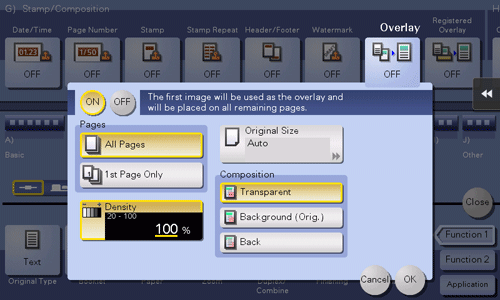 [Recall Overlay Image] | Specify which side of the paper to compose the overlay image, and select an overlay image to be composed. Check the density, composition method, preview, and other conditions of overlay image if necessary. If you set [Apply on Back], the image on the front side is composed on the back side of paper. |