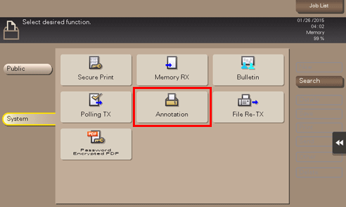 Tap [Utility] - [Administrator Settings] - [One-Touch/User Box Registration] - [Create User Box] - [Annotation User Box] - [New].