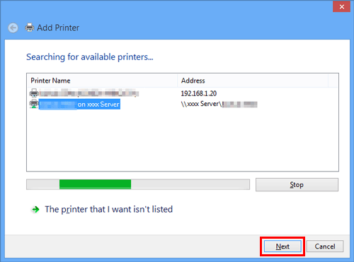 In the window showing the detected printer, click [The printer that I want isn't listed].