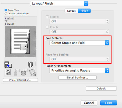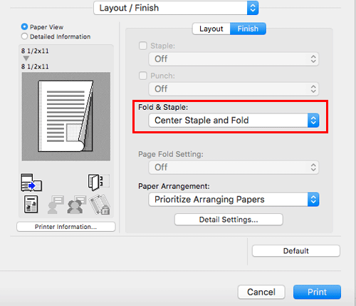 In [Fold & Staple:] in [Layout / Finish], select [Center Staple and Fold].