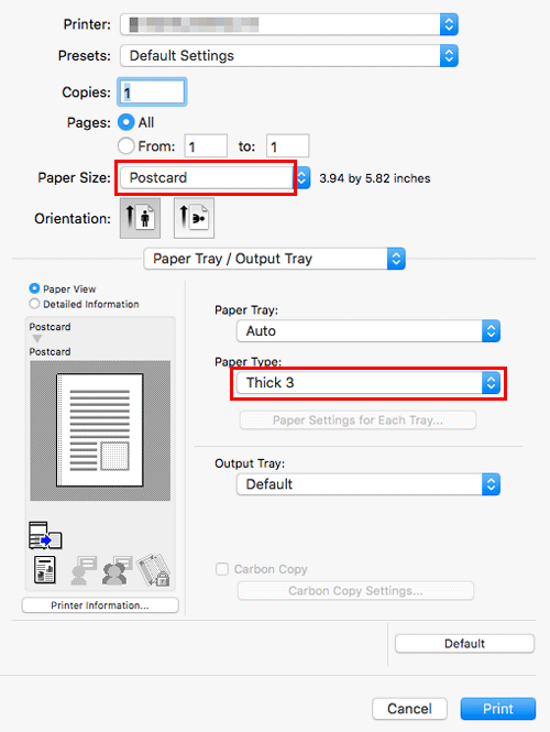 • If Postcard is selected, [Paper Type:] is automatically set to [Thick 3]. If [Envelope] is selected, [Paper Type:] is automatically set to [Envelope].