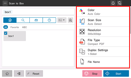 • Using the Stop key enables you to stop scanning the original. A list of the currently stopped jobs is displayed. To stop transmission, select the target job from the list, and delete it.