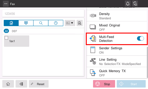 Selecting [Multi-Feed Detection] to ON stops scanning when the machine detects that the original is multiplexed on the ADF.