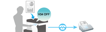 This machine uses the V.34 protocol communication by default. You can send faxes with V.34 canceled if it is not possible to establish a communication in the Super G3 mode depending on telephone line conditions (for example, when the remote or this machine is connected to a PBX line).