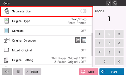 If the number of original sheets is so large that they cannot be loaded into the ADF at the same time, you can load them in several batches and handle them as one job. You can also scan the original using both ADF and Original Glass alternately.