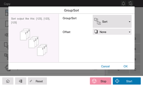 [Offset] | Select whether to shift and feed out copies separately by set or page. |
