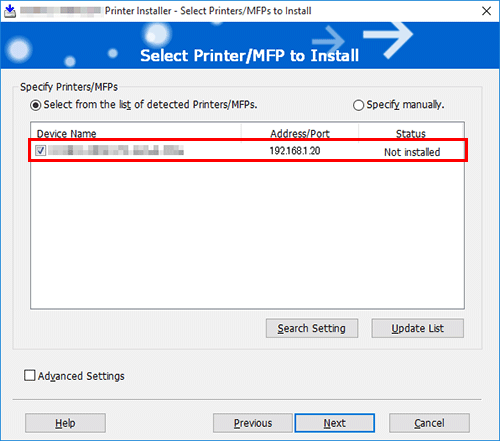 Select [Install printers/MFPs] in [Select menu to setup], and click [Next].