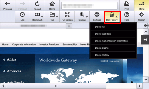 Select [Menu] - [Del. History] on the toolbar to delete Web data (Cookie, Web Storage, or Indexed Database), cache data, authentication information, and other information.