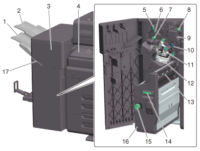 16 | Saddle Stitcher | Pull out this unit when clearing a paper jam or staple jam or when replacing a saddle staple cartridge. |