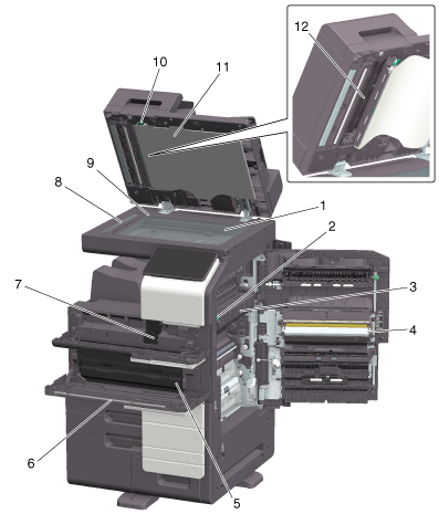 11 | Bypass Tray | Used to print data on irregularly size paper, thick paper, transparencies, postcards (4 6 (A6 Card)), envelopes, or label sheets. For details on the available paper, refer to Here. |