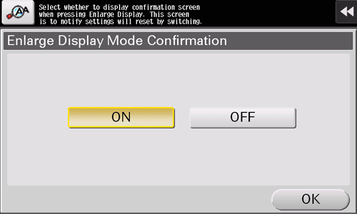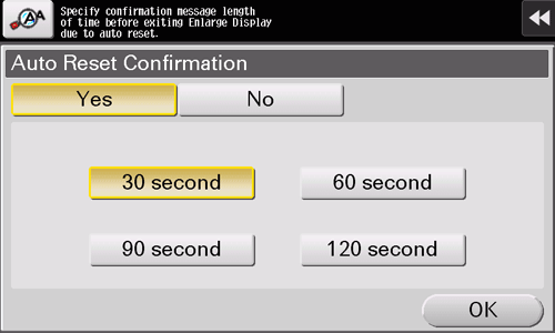 1. Select [Accessibility] - [System Auto Reset Confirmation], and select whether to check a cancellation of the Enlarge Display mode by displaying the screen (default: [No]). When displaying the screen, select the length of time to display the screen.
