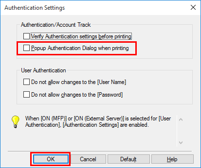 In [Authentication/Account Track], select the [Popup Authentication Dialog when printing] check box, then click [OK].