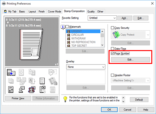 In the [Stamp/Composition] tab, select the [Page Number] check box, then click [Edit...].