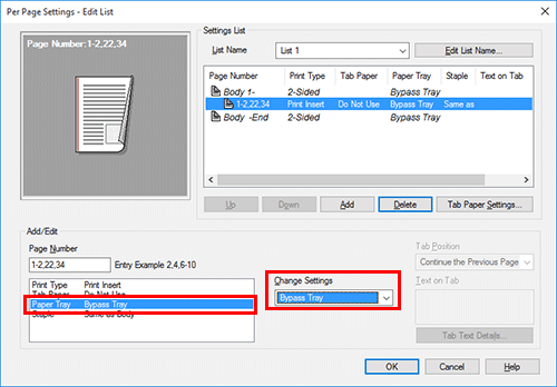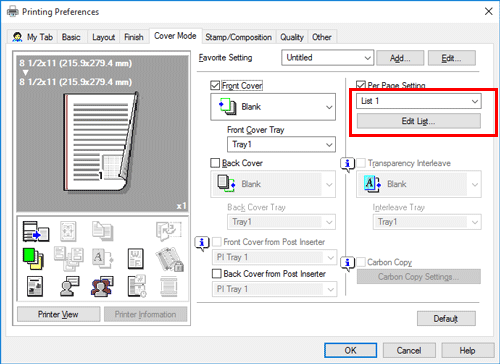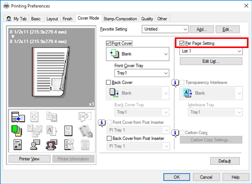 To print chapter covers on a different type of paper, select the [Per Page Setting] check box on the [Cover Mode] tab.