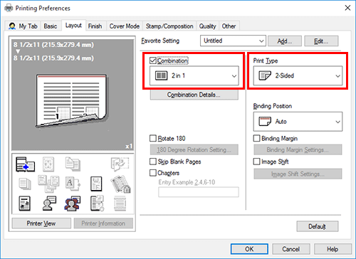 To print more than one original page onto the same side of a single sheet, select the [Combination] check box on the [Layout] tab to select a page combination format. To print on both sides of the paper, select [2-Sided] from [Print Type] on the [Layout] tab.