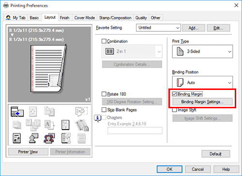 To configure the page margin, select the [Binding Margin] check box on the [Layout] tab and click [Binding Margin Settings].