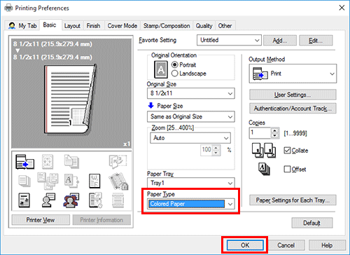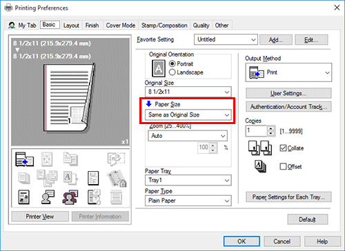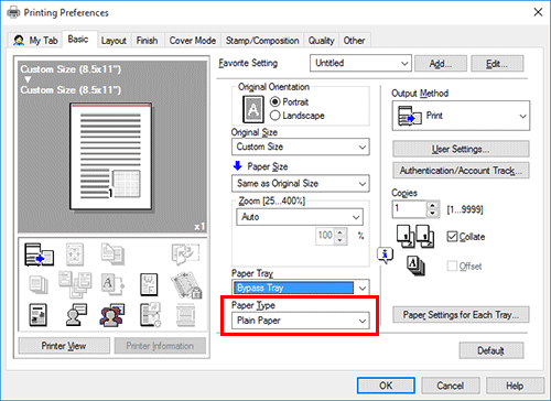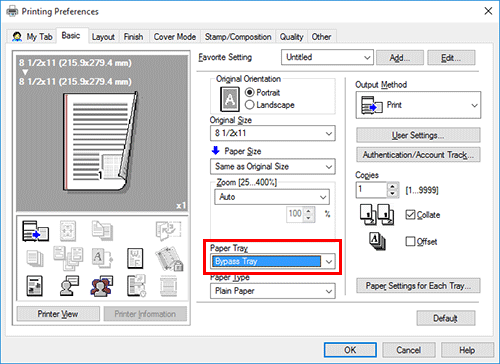 In [Paper Tray] in the [Basic] tab, select one other than [Auto].