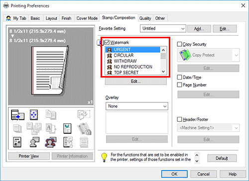 In the [Stamp/Composition] tab, select the [Watermark] check box, then select a watermark.