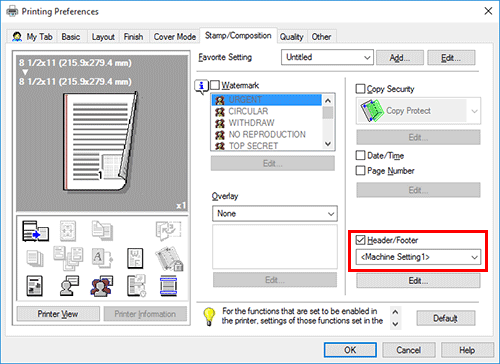 In the [Stamp/Composition] tab, select the [Header/Footer] check box, then select information to print out.