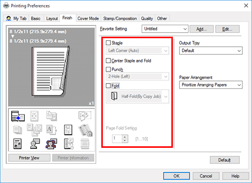 Select the check box for the desired finish on the [Finish] tab. If you have selected the [Staple], [Punch] or [Fold] check box, specify the quantity, positions and other necessary settings.