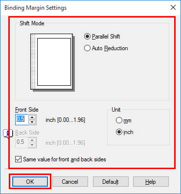 [Front Side]/[Back Side] | Enter the width of the page margin. For 2-sided printing, clearing the [Same value for front and back sides] check box allows you to specify different values for the front and back sides. |