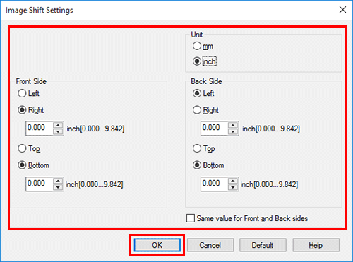 [Front Side]/[Back Side] | Set the direction and the value for shifting the printing position. For 2-sided printing, select the [Same value for Front and Back sides] check box allows you to specify the same value for the front and back sides. |