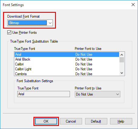 Select [Bitmap] from [Download Font Format], then click [OK].