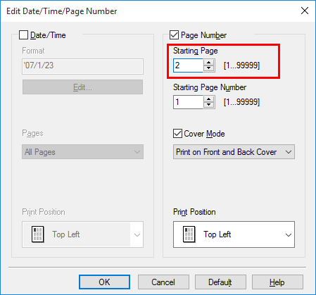 Q. I want to skip the number on the front cover when adding page numbers for printing. How can I configure the setting to print the second page in the same way as the first page?