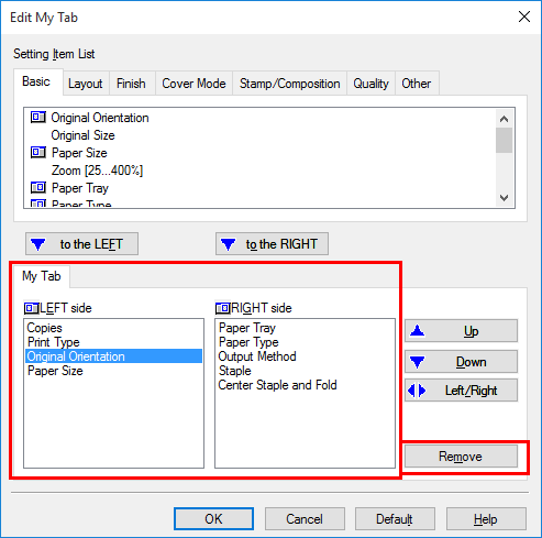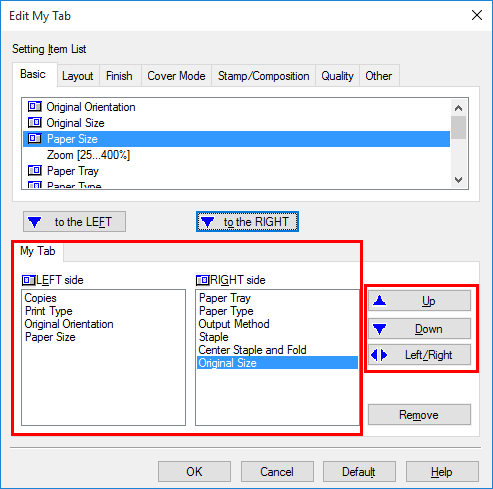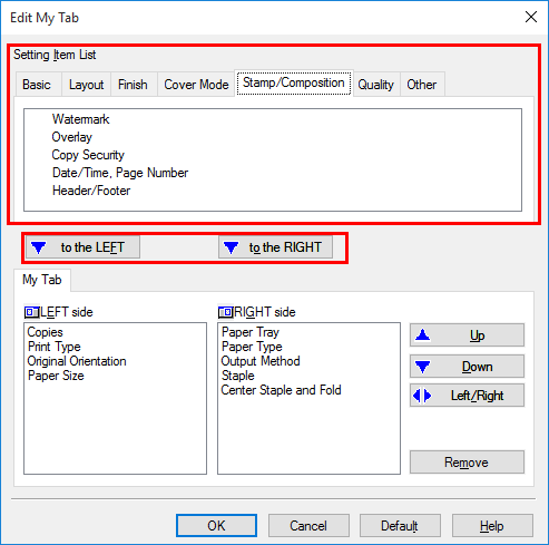To register functions on My Tab, select the functions to register from [Setting Item List] and click [to the LEFT] or [to the RIGHT].