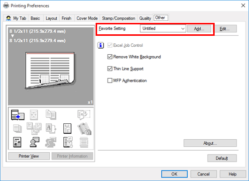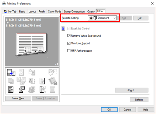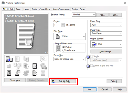 A. Yes. You can easily customize the window from the properties window of the printer driver by registering frequently used functions en masse on My Tab or registering settings for respective tabs as your favorite for quick activation.