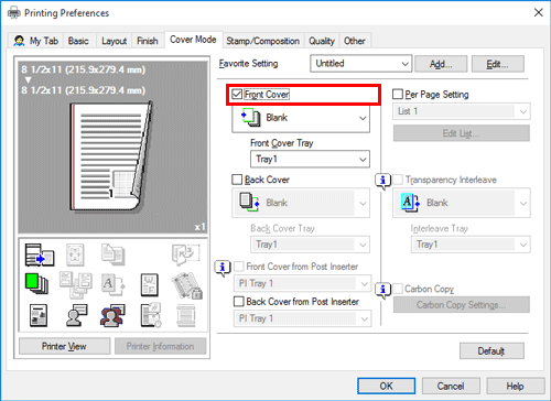 To print the cover on a different type of paper, select the [Front Cover] check box on the [Cover Mode] tab.