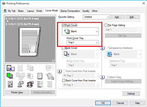 Select [Blank] or [Print] from [Front Cover] and a paper tray from [Front Cover Tray].