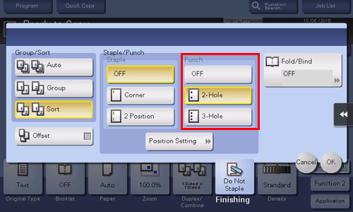 [Position Setting] | Select the punch position and original loading direction. If [Auto] is specified for the punch position, the punch position is determined automatically based on the direction of the loaded original. |