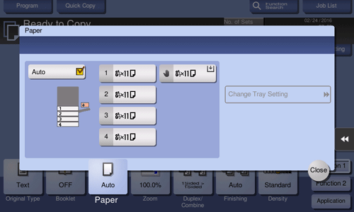 Paper Tray | Specifies the paper loaded in the paper tray when making a copy. The displayed contents vary depending on the options installed on this machine. |