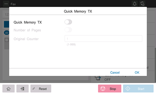 Quick Memory TX is a method to start sending a fax as soon as one page of the original has been scanned. The total number of sent pages can be entered in the sender record.