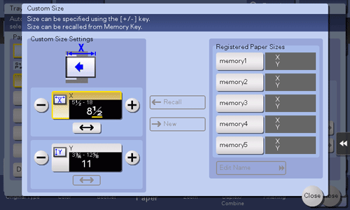 [Custom Size Settings] | Enter the length (X) and width (Y) of paper. After you entered the size, select a key ([memory1] to [memory5]) in [Registered Paper Sizes], and tap [New]. Then the size you have entered is registered in the memory. You can recall the registered size at a later date. |