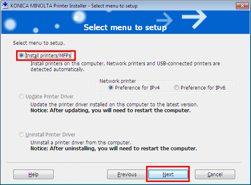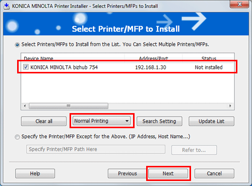 If the connection to this machine cannot be recognized, it is not displayed in the list. In such a case, select [Specify the Printer/MFP Except for the Above. (IP Address, Host Name...)], and manually specify the IP address and host name of this machine.