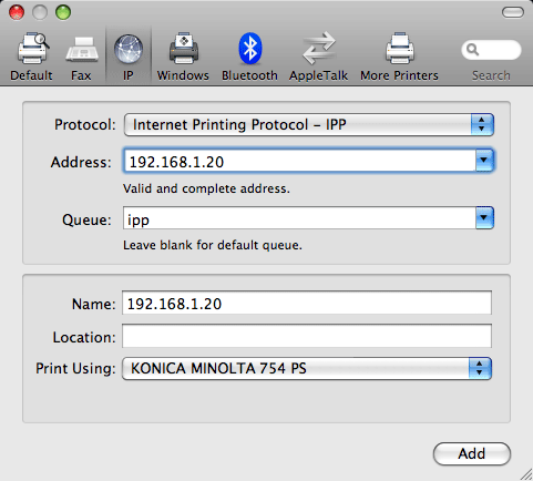 In [Address:], enter the IP address for the machine. In [Queue:], enter "ipp".