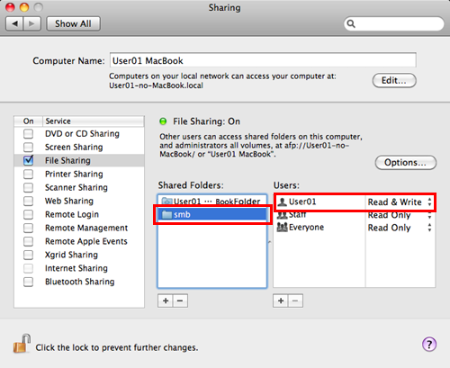 Click [Options], and select the [Share files and folders using SMB (Windows)]. Then, select the log-in user name (displayed name) check box.