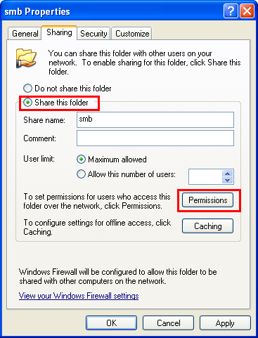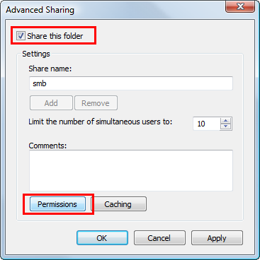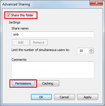 Select the [Share this folder] check box, then click [Permissions].