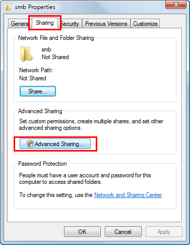 Click the [Sharing] tab, and also click [Advanced Sharing].