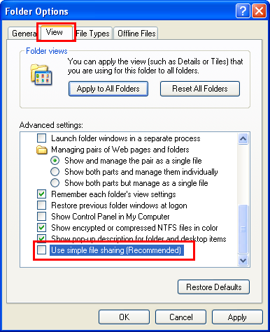 Click the [View] tab, and clear the [Use simple file sharing (Recommended)] check box.