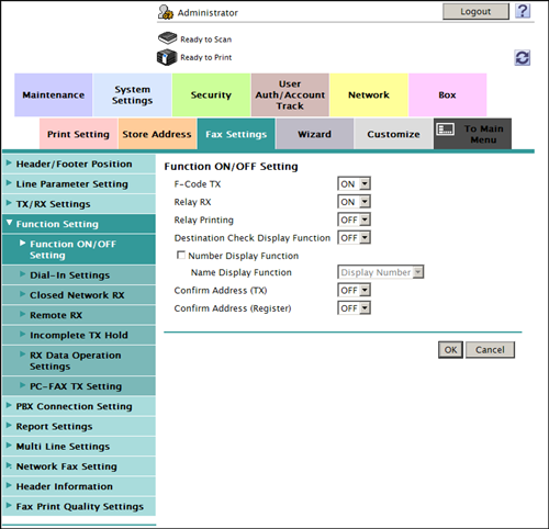 In the administrator mode, select [Fax Settings] - [Function Setting] - [Function ON/OFF Setting], then configure the following settings.