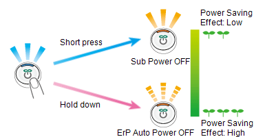 Short press | Sub Power OFF | Light up: Orange | This function reduces power consumption and has a greater power saving effect. While the sub power is turned off, this machine can receive data or faxes, however, it cannot scan or print an original. If data or faxes are received while the sub power is turned off, they are printed when the machine returns to the normal mode. To enable the machine to return to the normal mode from the Sub Power Off status, press the Power key again. |