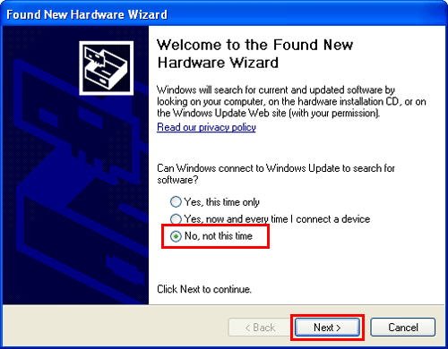 If the [Windows connect to Windows Update] screen appears, select [No, not this time], then click [Next].