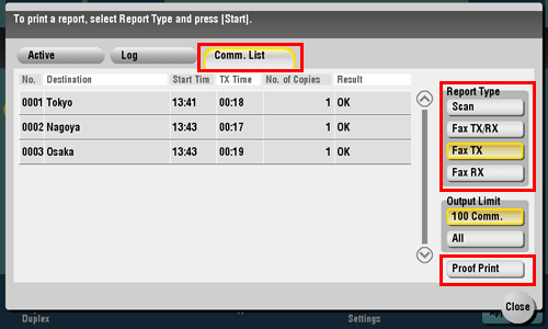 Specify a report type in [Report Type] on the [Comm. List] tab, and tap [Proof Print], then press Start.