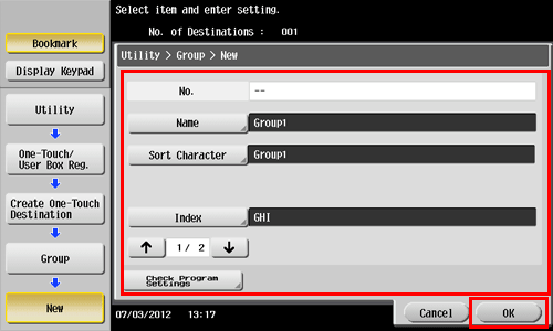 [Index] | Select a search text. Group destinations are displayed on the top screen in scan/fax mode as sorted by index specified here. For a frequently used destination, specify the index characters and select [Favorites] at the same time. This allows you to find it more easily. |