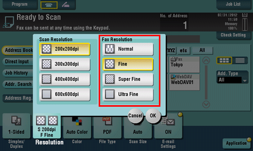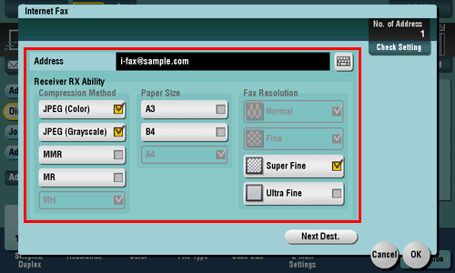 Enter the E-mail address of the destination in [Address] and select a compression format, paper size and resolution supported by the recipient machine from [Receiver RX Ability].