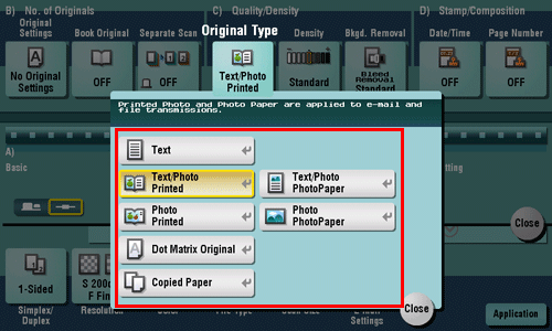 Tap [Application] to select [Original Type], then select an option according to the quality of the original to be faxed.