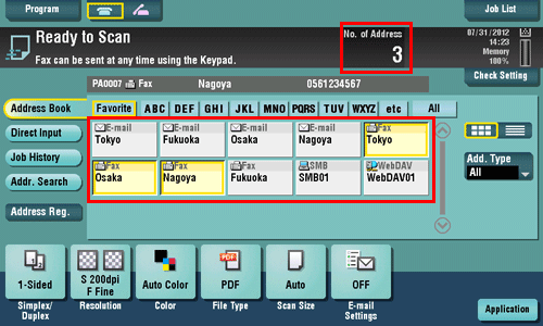 You can select more than one one-touch destination from the address book. [No. of] displays the number of selected destinations.